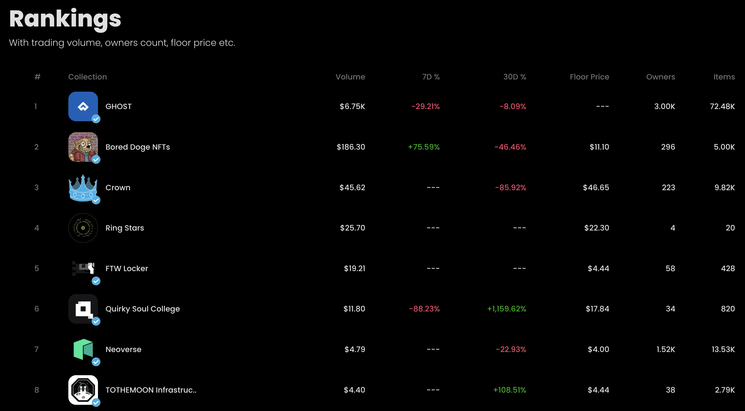 The rankings page shows a leaderboard for every collection on GhostMarket, across all supported blockchains. The leaderboard shows weekly results across all blockchains by default, but these settings can be changed in the menu to the left of the page. Clicking on any of the collections will also direct you to the collection’s profile.