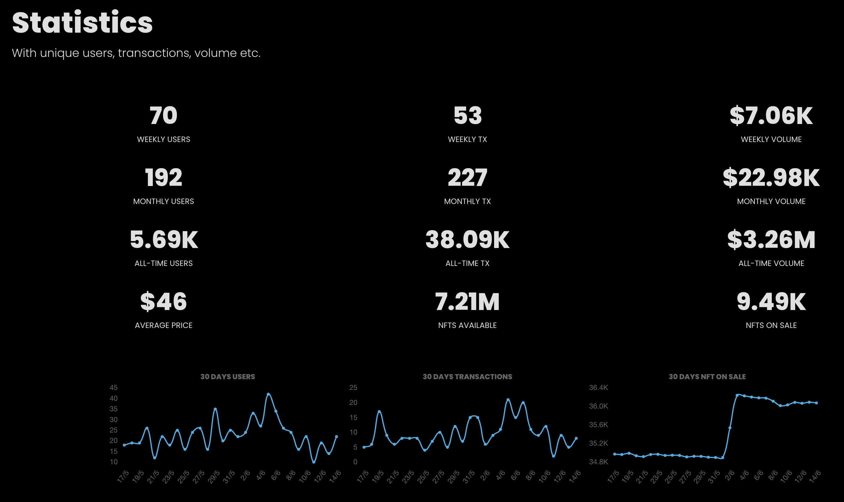 The statistics page shows all time stats for all blockchains on GhostMarket combined, as well as individually.