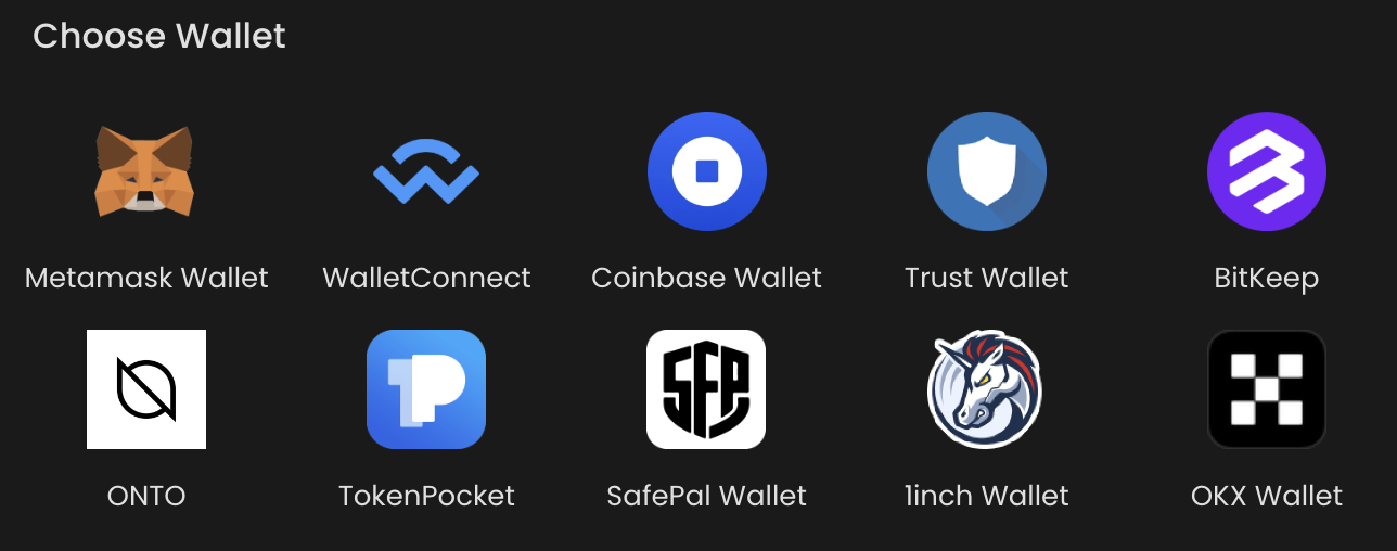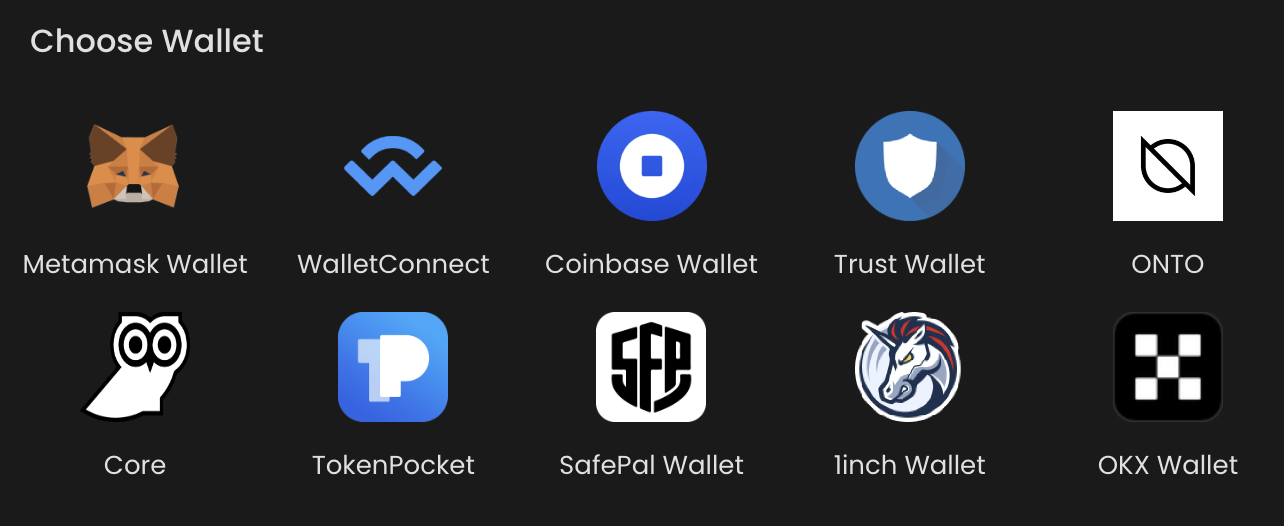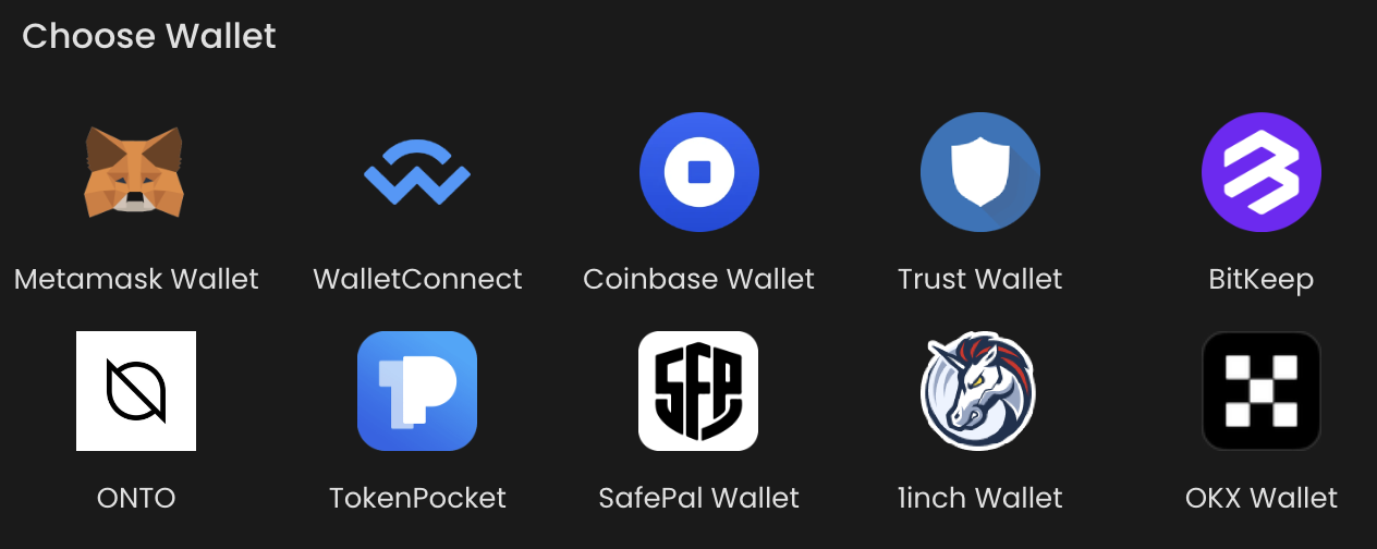 Metamask Wallet , WalletConnect, Coinbase Wallet, Trust Wallet , BitKeep, ONTO, TokenPocket, SafePal Wallet , 1inch Wallet, OKX Wallet